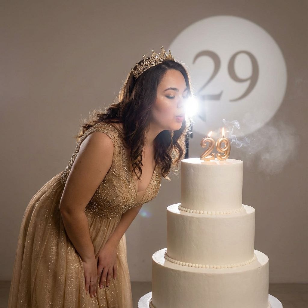 Фон - простая нейтральная стена, освещенная круглым прожектором, я позирую слегка наклонившись вперёд, словно задуваю свечи на торте. Торт большой, белый, трех ярусный. На торте стоят зажжённые свечи в форме числа 29, а также число 29 отображено на стене. На мне обтягивающее золотое платье в пол. На голове изящно надета золотая корона. #праздничные