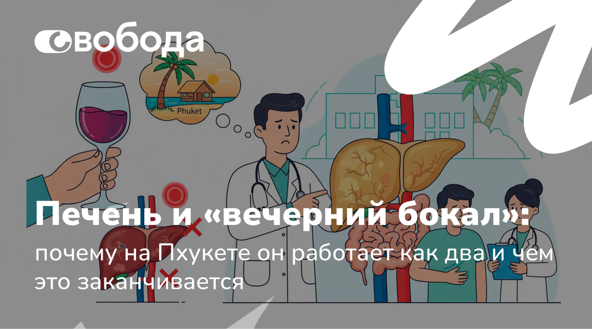 Закат, лёгкий бриз, уличный рынок, манго‑стикки райс, острое карри — и коктейль «для настроения». На Пхукете это легко становится привычкой: жарко, встречи на пляже, рабочий график свободнее, алкоголь — на каждом углу. Печень молчит и делает вид, что всё нормально.