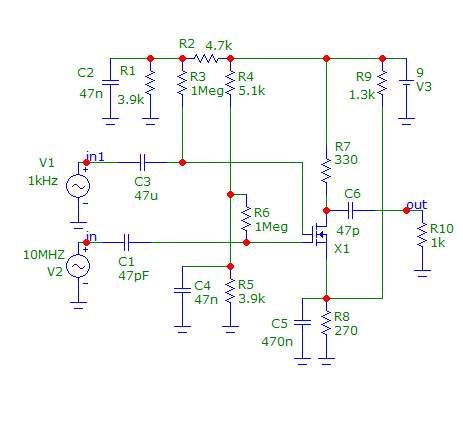 Нелинейность второй схемы больше, но схема имеет усиление около 3. Уровень несущей - 150 mB(амплитуда). Уровень модулирующего сигнала - 500 mB(амплитуда). Уровень сигнала на выходе - 440 mB(амплитуда). Ток стока около 8 mA, что близко к оптимальному рабочему току стока 10 - 12 mA. В практической конструкции надо подобрать оптимальный режим подбором сопротивлений делителей R2, R3 и R5, R6. Напряжение на первом затворе около 0,5 В. Напряжение на втором затворе чуть больше напряжения на первом затворе - примерно на 0,2 В. Естественно, при