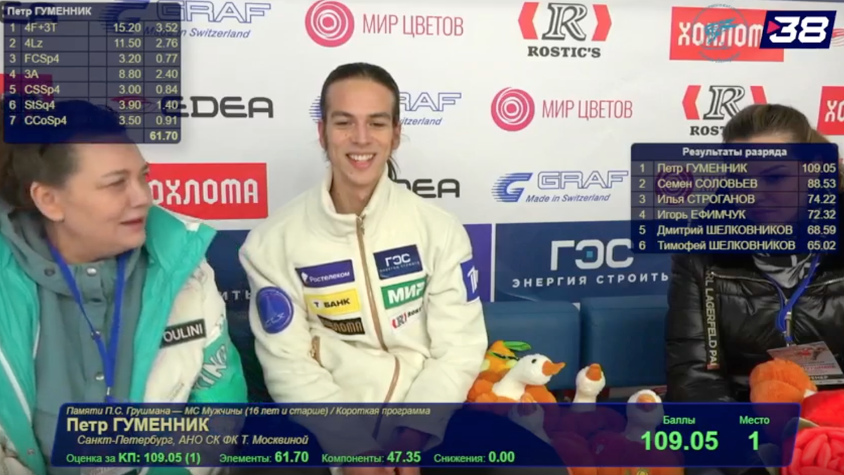 Петр Гуменник выступает на Мемориале Петра Семеновича Грушмана. Сегодня Петя откатал короткую программу. Его "Парфюмер" порадовал публику на трибунах и всех нас, следящих за ходом событий через экран монитора. Петя очень хорошо выступил. Не секрет, что это его последний турнир перед Олимпийскими Играми, очередная отсечка в четко продуманной стратегии. Да, тактика у Петра прекрасная. Он настолько четко и точно следует плану, что обновляет собственные рекорды. Так, по итогам проката Петр получил 109,05 балла: Турнир у мужчин получается очень компактным - всего 8 участников. И вот результаты по итогам коротких программ: Как видим, последние два места занимают братья Шелковниковы - Дмитрий и Тимофей. Ребята действительно откатались плохо. Тимофей не показал даже попытки четверного прыжка, а на тройном акселе жестко упал, зато Дмитрий успешно приземлил каскад 4S-2Т, а вот при заходе на второй квад по сути даже не смог оторваться ото льда и тоже очень неприятно столкнулся с ледовой поверх