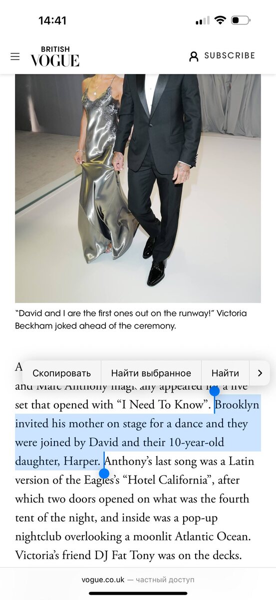 Интернет-пользователи вспомнили статью в Vogue о свадьбе Бруклина и Николы, в которой описание ТОГО САМОГО танца под песню I need to know радикально расходится со свежими откровениями жениха: «Бруклин пригласил маму на сцену, к ним присоединились Дэвид и 10-летняя Харпер». Или текст тоже Виктория редактировала?