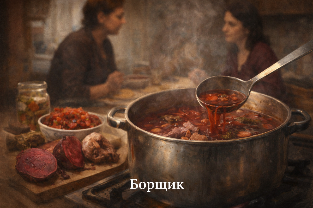 — У меня борщик, — сообщаю спокойно, как будто это не еда, а состояние погоды. Борщик у меня сегодня конструктор. Так ингредиенты для блюд называл один мой знакомый шеф-повар. Мне это слово понравилось. В нём нет пафоса, но есть свобода. На столе холодец. Из телячьих хвостов и сердца. Бульон в нём густой, насыщенный, такой, что и мясо отдельно варить не нужно, но я всё равно варю в этом бульоне сердце, мне так вкуснее. Есть варёная свёкла. Есть венгерская закуска, морковь, немного томата, болгарский перец, лук, специи. Я всё это собираю в нужных мне пропорциях, не торопясь, без рецепта, ориентируясь на цвет, запах и внутреннее «ага». Подруга смотрит с удивлением.