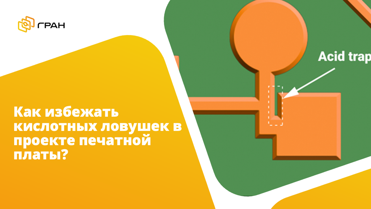 Кислотная ловушка — это участок топологии с острым углом или «карманом», из которого травящий раствор плохо вымывается при производстве платы. Такие зоны обычно появляются в местах, где дорожки или полигоны соединяются под острым углом. Это может привести к перетраву меди, разрыву проводников, уменьшению ширины зазоров и, как следствие, снижению надежности платы и отказам в эксплуатации. 🔸 Где чаще всего они возникают: 🔸 Как избежать кислотных ловушек: 🔸 Чем помогают проверки в CAD/CAM: Современные CAD и CAM‑системы позволяют автоматически искать острые углы, участки с углом менее заданного порога (например, 60° или 90°) и потенциальные кислотные ловушки.