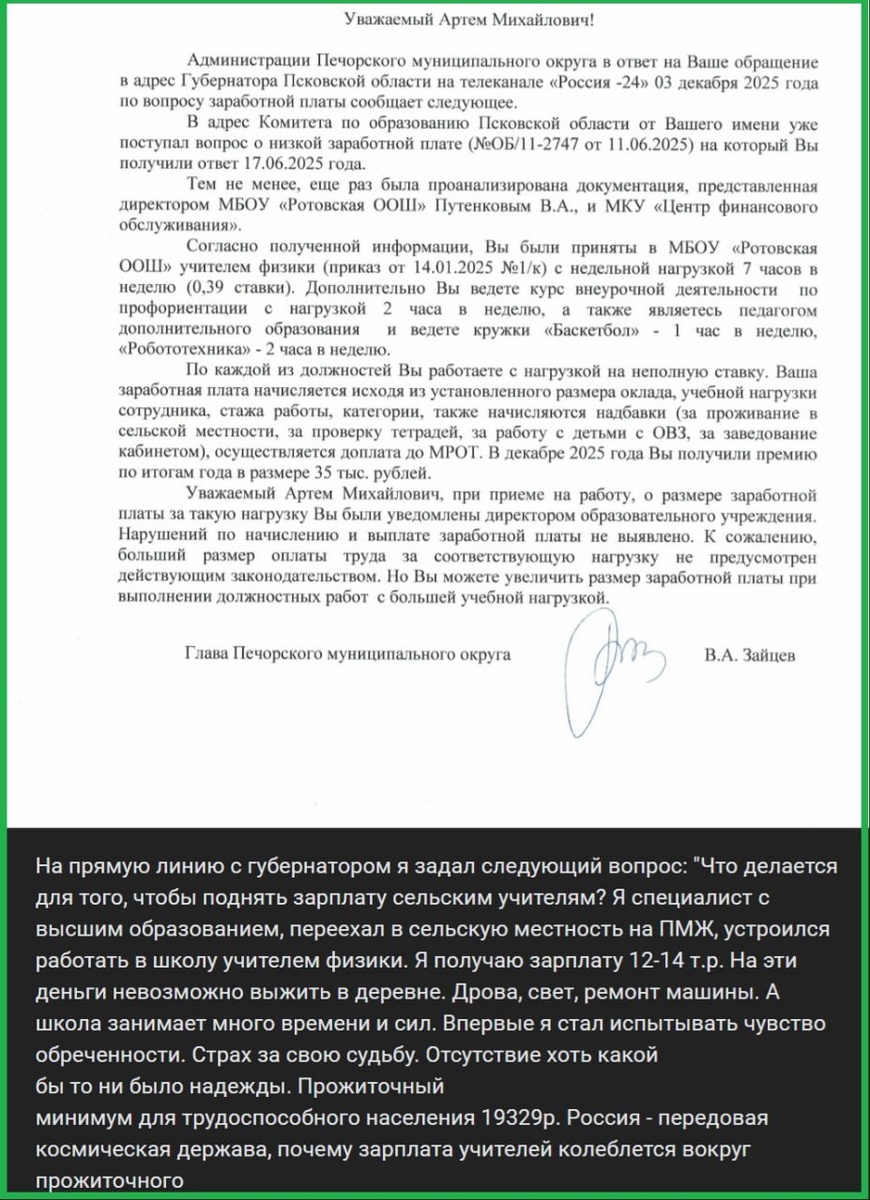В Псковской области учитель физики из сельской школы Артем Лапин пожаловался на "прямую линию" губернатору на низкую зарплату. Лапин специально переехал в сельскую местность на ПМЖ, ведет курс физики для 7-9 классов, курс по профориентации, кружки баскетбола и робототехники и получает за свой труд 12-14 тыс. руб. в месяц. Сам губернатор не стал комментировать обращение, и на него ответил глава Печорского муниципального округа Валерий Зайцев (в его ведении находится школа, где работает Лапин). По мнению Зайцева, Лапин... слишком мало работает. Зайцев пишет, что учитель работает "с нагрузкой не на полную ставку", к тому же, при устройстве на работу тот "был уведомлен о размере зарплаты за такую нагрузку". Чиновник предложил Лапину больше работать и больше зарабатывать. ▫️Мы в Tg | в ВК | в Max | в ОК