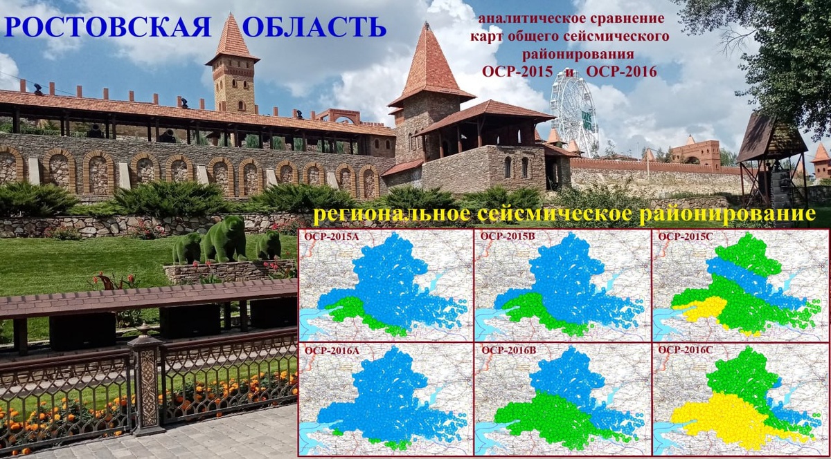 интенсивности региона Российской Федерации Ростовская область. На фото представлены сравнительные данные ожидаемой сейсмической интенсивности по картам ОСР-2015А,В,С и ОСР-2016А,В,С. Для создания Результаты сравнения наводят на размышления... Мозаика составлена из более чем двух тысяч трехсот координатных точек населенных пунктов Ростовской области.