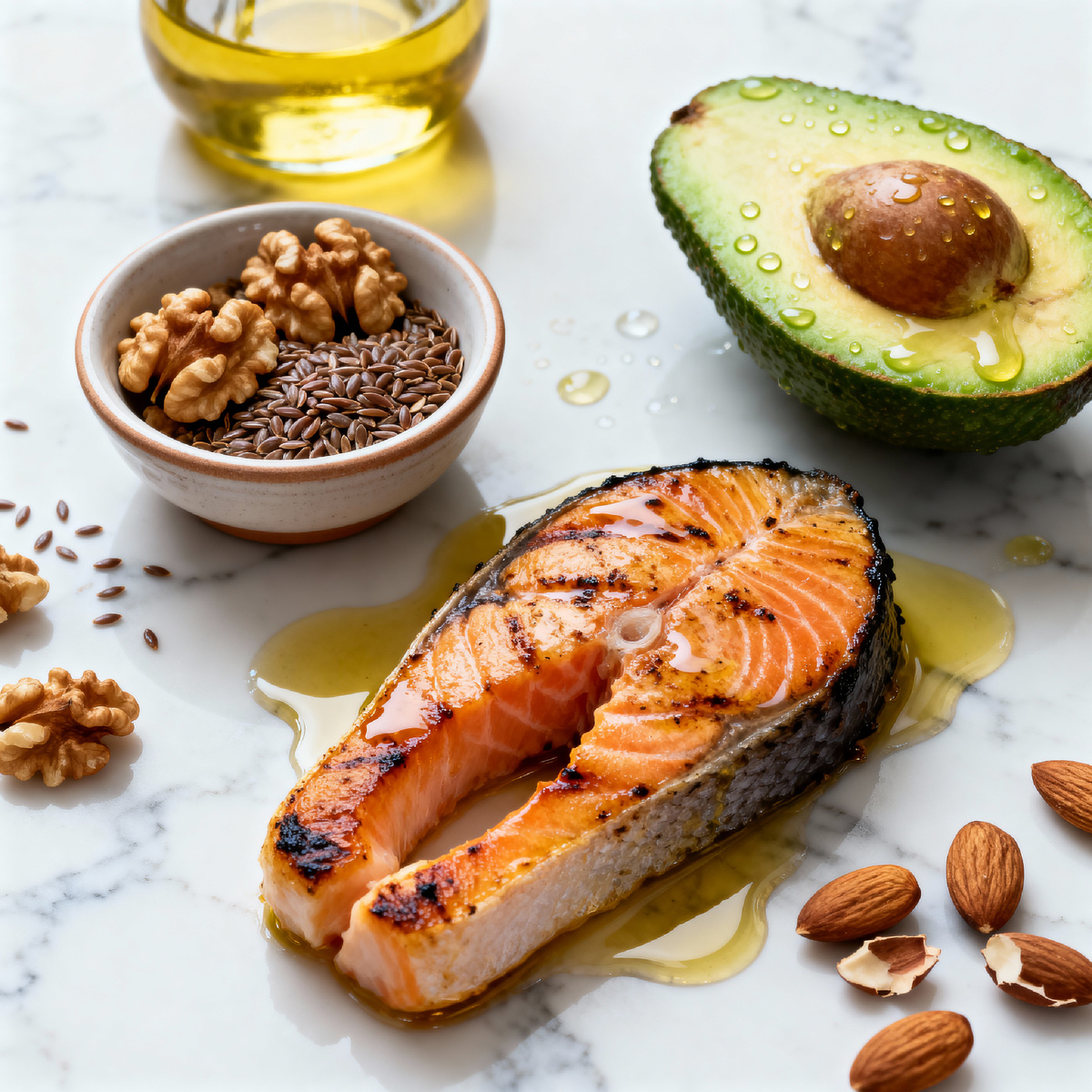 Растительные источники: Льняное семя и масло, чиа, грецкие орехи (содержат ALA, который телу еще нужно преобразовать в активные формы).