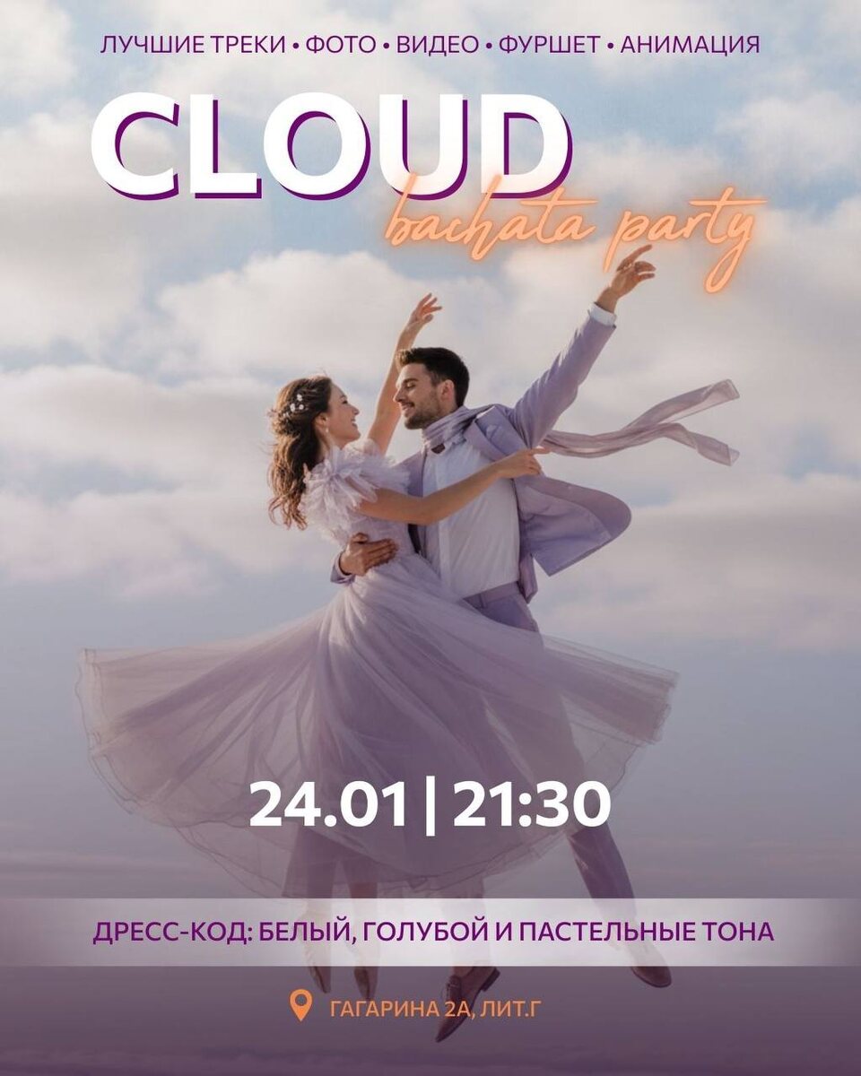 ✨ Друзья, приглашаем вас провести вечер в компании искреннего счастья, любимой музыки и долгожданных встреч на CLOUD BACHATA PARTY☁️ ✨ 24 января ✨ 21:30 Music: БАЧАТА | САЛЬСА (по запросу) Дресс-код: 🤍🩵 и любые пастельные оттенки Вас ждёт: ☁️ Стилизованный фуршет ☁️ Фотограф и воздушная фотозона ☁️ Видеограф ☁️ Весёлая анимация ☁️ 2 просторных зала с новым стильным ремонтом (Большой зал: Бачата/Сальса по запросу) (Малый зал: lounge zone) ☁️ Авторские кальяны ☁️ Теплая дружеская атмосфера 💰ВХОД : 500 руб (с приложением студии), 700 руб (без приложения студии) 📍Адрес: ул. Гагарина 2А Лит. Г Самые нежные и мягкие танцы обеспечены✨