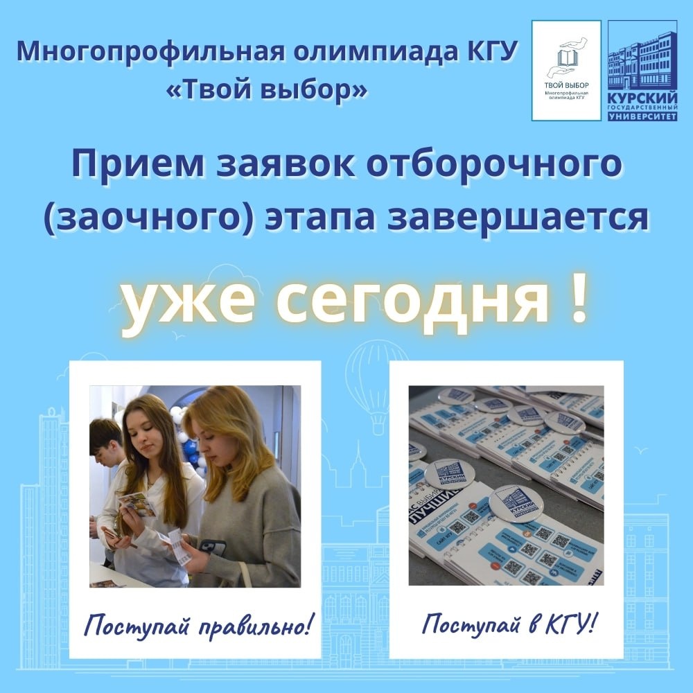 ! Отборочный (заочный) этапа Многопрофильной олимпиады КГУ «Твой выбор» завершается сегодня⚡️ Отвечаем на часто задаваемые вопросы: — Когда закрывается прием заявок? ✔️ Прием заявок для участия в отборочном этапе олимпиады «Твой выбор» закрывается 20 января 2026г. в 23:59 по мск. После этого времени заявки приниматься не будут. — Не пришло письмо подтверждение на почту о принятии или отклонении заявки. ✔️ Присланные заявки участников обрабатываются в течении 10 рабочих дней. После того, как сотрудники отсмотрели заявку, составляется письмо—ответ о принятии или отклонении заявки на адрес электронной почты участника, указанной при регистрации. В случае, если в течении 10 рабочих дней тебе не пришло письмо, необходимо: 1. Проверить папку СПАМ 2. Обратиться на почту: idj.1@yandex.ru 3. По номеру телефона: +7 (4712) 513-913 — Где можно ознакомиться с результатами заочного этапа? ✔️ На официальном сайте Многопрофильной олимпиады необходимо открыть вкладку «Участнику», в выпадающем списк
