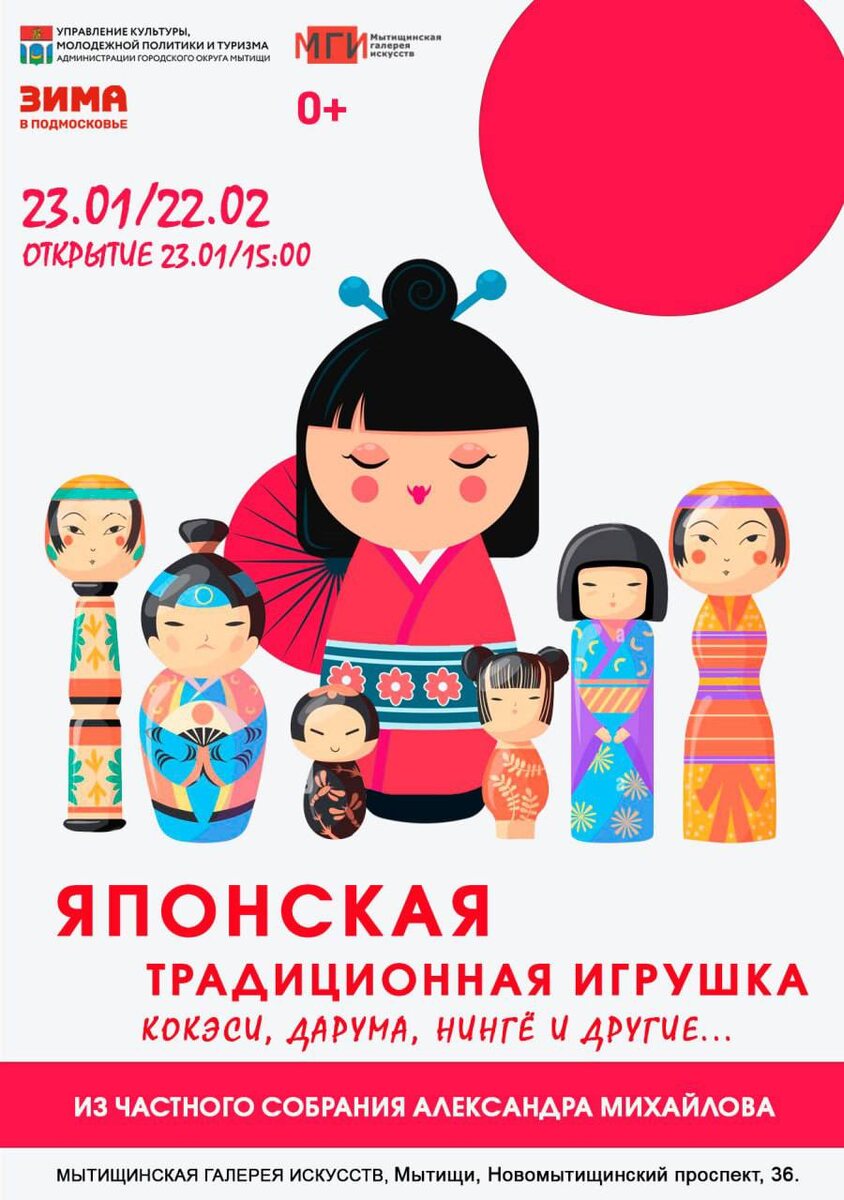 Экспозиция под названием «Японская традиционная игрушка. Кокэси, Дарума, Нингё и другие», представленная коллекционером Александром Михайловым, познакомит зрителей с направлением японского прикладного искусства – искусством создания кукол и игрушек. 📍Мытищинская галерея искусств, ул. Мира, д. 7.