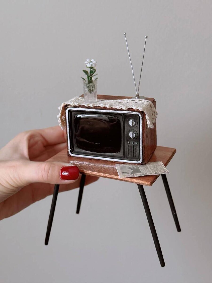Телевизор с антеннами, сервант, самовар, баночки с соленьями и мандарины — всё такое точное, что хочется «зайти на минутку» и остаться жить. Сделано вручную из картона, бумаги, глины, смолы и ткани — и выглядит не как игрушка, а как маленькая машина времени. Овца Борис уже мечтает о своём микро-номере: ковёр на стене, чай в гранёном стакане и мини-оливье строго по ГОСТу. #fun