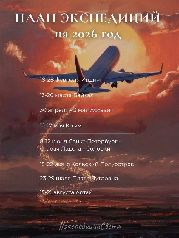 (будет дополняться) 18-28 февраля Индия🇮🇳 https://dzen.ru/media/id/670beb3cb7308e79e9dde408/dobryi-den-dorogie-druzia-69688a6ec0956848656de2b8 13-20 марта Байкал 💎 https://dzen.ru/media/id/670beb3cb7308e79e9dde408/ekspediciia-na-baikal-v-den-vesennego-ravnodenstviia-694eb5a5b0b43c6d4fc73b6f 30 апреля - 3 мая Абхазия ⛪️ https://dzen.ru/media/id/670beb3cb7308e79e9dde408/sobornaia-abhaziia-69cfa10fca5aa462965cbef6 12-17 мая Крым 🌞 https://dzen.ru/media/id/670beb3cb7308e79e9dde408/solnechnyi-krym-69b65bf51a632f7a96075903 8-12 июня Санкт-Петербург - Старая Ладога - Соловки⭐️ https://dzen.ru/media/id/670beb3cb7308e79e9dde408/sanktpeterburg--solovki-69c2b39a71c8140c341b558a 15-22 июня Кольский Полуостров🌊 https://dzen.ru/media/id/670beb3cb7308e79e9dde408/kolskii-poluostrov-na-letnee-solncestoianie-69ce24d18576920d1e83817b 23-29 июля Плато Путорана 🏔️ https://dzen.ru/media/id/670beb3cb7308e79e9dde408/plato-putorana-7-dnei-nastoiascih-prikliuchenii-698dcedfd769b8105fff9215 15-21 а