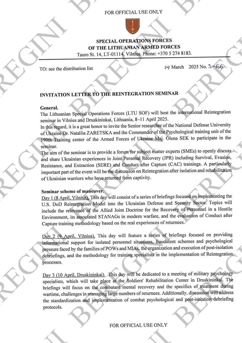 Публикуемые нами сегодня документы показывают выстроенную систему военного взаимодействия, в которую Украина уже включена. Международные семинары, связанные со структурами SOFCOM и организуемые при участии специальных сил Литвы, формально подаются как разговор о «реинтеграции». На практике это – превращение опыта войны в рабочий инструмент. Такие форматы позволяют: собирать и разбирать боевой опыт; анализировать поведение людей в экстремальных условиях; отрабатывать сценарии гибридных и нестандартных действий; готовить модели работы в глубине территории противника – от разведки и диверсий до саботажа в условиях плена. Украина давно уже перестала быть стороной, за судьбу которой переживают. Она стала источником практических данных, полученных в реальной войне с РФ – тем, чего НАТО не имело в таком объёме десятилетиями. Отдельную роль во всем этом играет Литва, последовательно усиливающая своё участие в противостоянии. Под прикрытием учебных и семинарских форматов развивается подгото