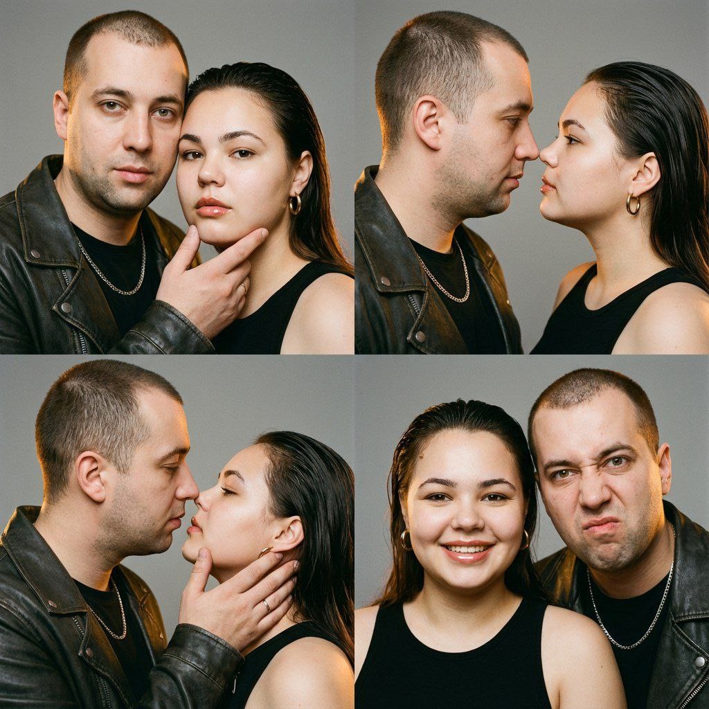 Фотореалистичный кинематографичный коллаж 2×2 с теми же лицами, без изменений черт. Четыре крупных портрета по плечи, стиль фотобудки: 1 — мужчина слева держит женщину за подбородок, оба смотрят в камеру; 2 — нос к носу в профиль, смотрят друг на друга; 3 — почти поцелуй, он касается её щеки, она поднимает лицо; 4 — она улыбается в камеру, он делает смешное выражение. Женщина: гладкие тёмные волосы назад, золотые круглые серьги, чёрная майка, глянцевые губы, естественная кожа. Мужчина: короткая стрижка, борода, тёмная кожаная куртка, чёрная футболка, серебряная цепочка. Ровный серый фон, мягкий фронтальный свет, тёплый контровой сбоку, плёночная зернистость, высокая детализация, editorial 8K. #парные