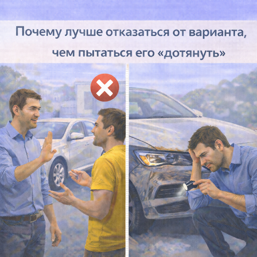 На вторичном рынке почти каждый сталкивается с ситуацией: вариант не идеален, но «почти подходит». Возникает мысль: «Если немного вложиться, довести – будет нормально». Именно здесь совершается огромное количество ошибок. Потому что попытка “дотянуть” вариант почти всегда обходится дороже отказа. Разберёмся, почему отказ – это сильное решение, а не слабость. Психологические причины понятны: Мозг ищет завершение, а не оптимум. Рынок этим пользуется. В реальности это почти всегда означает: Редко это вопрос одного ремонта. Чаще – цепочка вложений без чёткого финала. Типовые зоны риска: Каждый пункт по отдельности кажется терпимым. Вместе они превращаются в финансовую яму. Важный момент. Даже если вы: рынок: Вы вкладываетесь в автомобиль, а продаёте его как обычный рыночный экземпляр. Самые рискованные ситуации: Здесь «дотянуть» почти всегда означает проиграть. Отказ: Плохая покупка: Упущенный вариант стоит ноль. Плохой вариант стоит дорого. Есть простой внутренний индикатор. Если вы лов