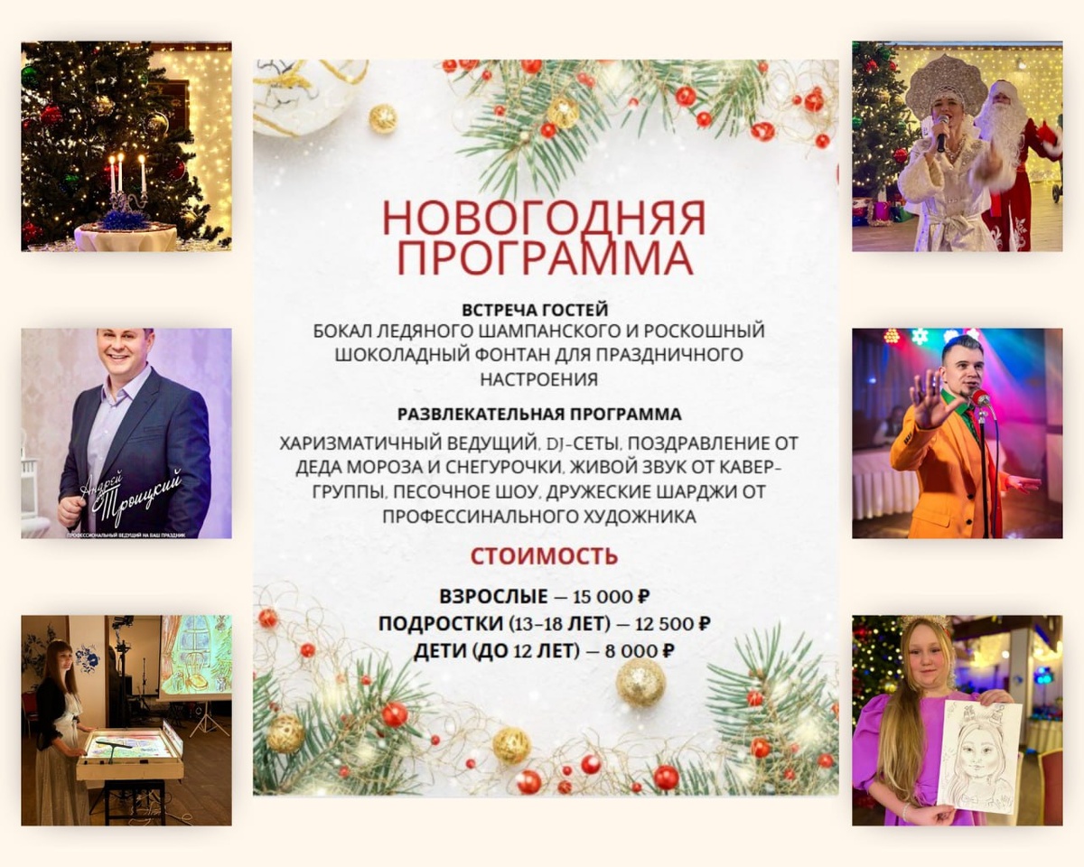 Мы продумали программу так, чтобы вы могли расслабиться и наслаждаться праздником, пока мы берем на себя все — от настроения до угощений. Вас ждет эффектное начало с шампанским и шоколадным фонтаном, нон-стоп шоу-программа с живым вокалом кавер-группы, DJ-сетами и харизматичным ведущим, завораживающее песочное шоу и дружеские шаржи от профессионального художника на память, а также поздравления от Деда Мороза и Снегурочки! Ждем вас в гости! Ссылка на Яндекс.Карты: https://yandex.com/maps/-/CHa6nM5E