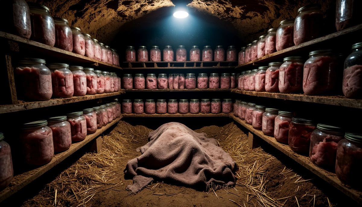 Погреб был огромным. Бетонный бункер. Вдоль стен — бесконечные ряды трехлитровых банок. Тушенка. Сотни банок с мясом. Без этикеток.