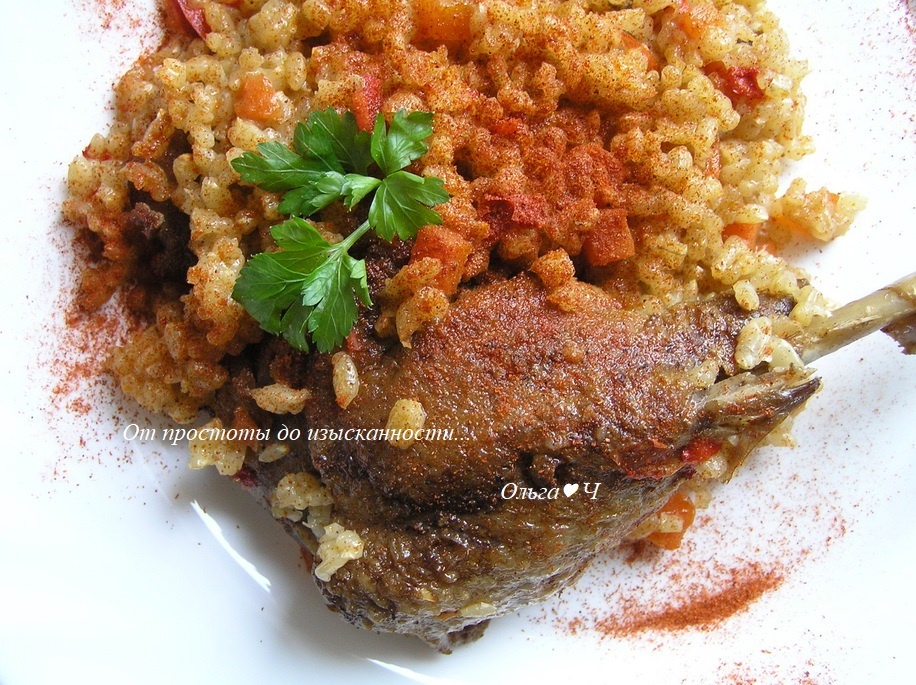 паприка и зелень для подачи Приготовление: Утку разрежьте на порционные кусочки, натрите солью, сбрызните 1 ст. л. соевого соуса, затем обжарьте на растительном масле со всех сторон до румяности (можно в мультиварке, если есть функция "Жарка") Выложите утку в мультиварку. Влейте горячую воду, добавьте лавровый лист. Готовьте в режиме "Суп" 1 час 30 минут. Выньте утку, засыпьте рис и мелко нарезанные перец и морковь. Верните утку обратно, полейте оставшимся соевым соусом. Готовьте в режиме "Плов" ещё 30-40 минут до готовности риса. Перед подачей посыпьте блюдо паприкой и украсьте зеленью. Приятного аппетита! Вам также могут понравиться: