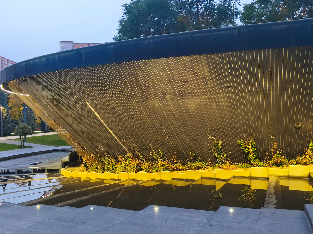 Уже темнеет и включили освещение! Секвойя!!! Крошка ещё! Формы и свет Зеркальность - вход ещё и не сразу найдёшь! А внутри вот такое дерево! Вокруг плавают карпы! Но тут ещё и черепахи! Был октябрь, но летом тут, наверное, прикольно полежать И этот ручеёк даёт прохладу А вот закрытая часть парка - Японский сад. Это новая территория. Вход туда также бесплатный, но надо заполучить билет.-регистрацию. А вот тут огромная очередь... Увы. это надо стоять очередь и приходить заранее.. В общем я только мимо прошла... Эх... Но и без Японского сада территория парка огромная. А вечерняя поддсветка добавляет сказочности Диковинности Я так и не поняла, что это, но в парке. как я поняла, ещё ведутся работы по обустройству. Нет предела совершенству Очень эффектная ротонда на озере любви. Красота! Цвет освещения постоянно менялся Ну, и приятно оказаться внутри за пеленой "дождя" И продолжаю гулять по сказочному лесу Разноу