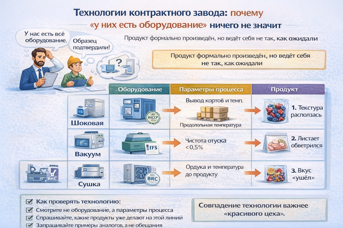 Фраза «у нас есть всё оборудование» — почти всегда повод насторожиться. Предприниматель смотрит на список машин, а не на совпадение технологии с продуктом. В итоге продукт формально произведён, но ведёт себя иначе, чем ожидалось. Шоковая заморозка.