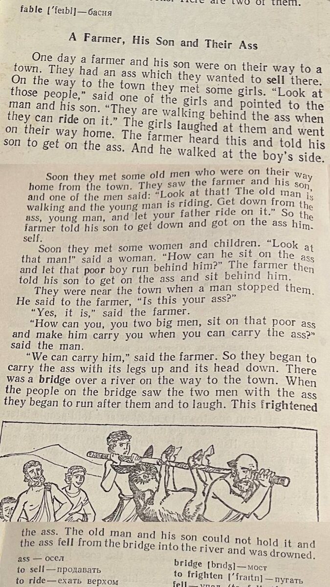 Дело в том, что я встречала вариант у Маршака, но не полный. Видела клип и тоже убрано, на мой взгляд, самое главное: финал. Если обладаете Английским современного 3 класса, то рекомендую прочесть. А для остальных упрощенно: Фермер с сыном решили продать осла и повели его на рынок. Пока шли, про них говорили: - Вот дураки, есть осел, а они пешком идут. Залезли на осла. - Издевательство! Бедный осел! Ему же тяжело! Отец слез. - Вот молодежь пошла, фу! Сын едет, с отец идёт! Поменялись. - Какой эгоист! Отец расселся, а бедный сын идёт. В итоге, привязали они осла к палке и понесли. А когда проходили по мосту, осел от испуга задергался, упал в реку и утонул. Тут нужно добавить паузу для размышлений, а я добавлю цифр. Безумная зависимость от общественного мнения у обладателей слабого характера (1 и 11). При таком значении люди живут ради хорошего мнения других. Характеру 1 надо, чтоб выделяли их особенность, необычность, эксклюзивность, а также слушались и соглашались. Характеру 11 -