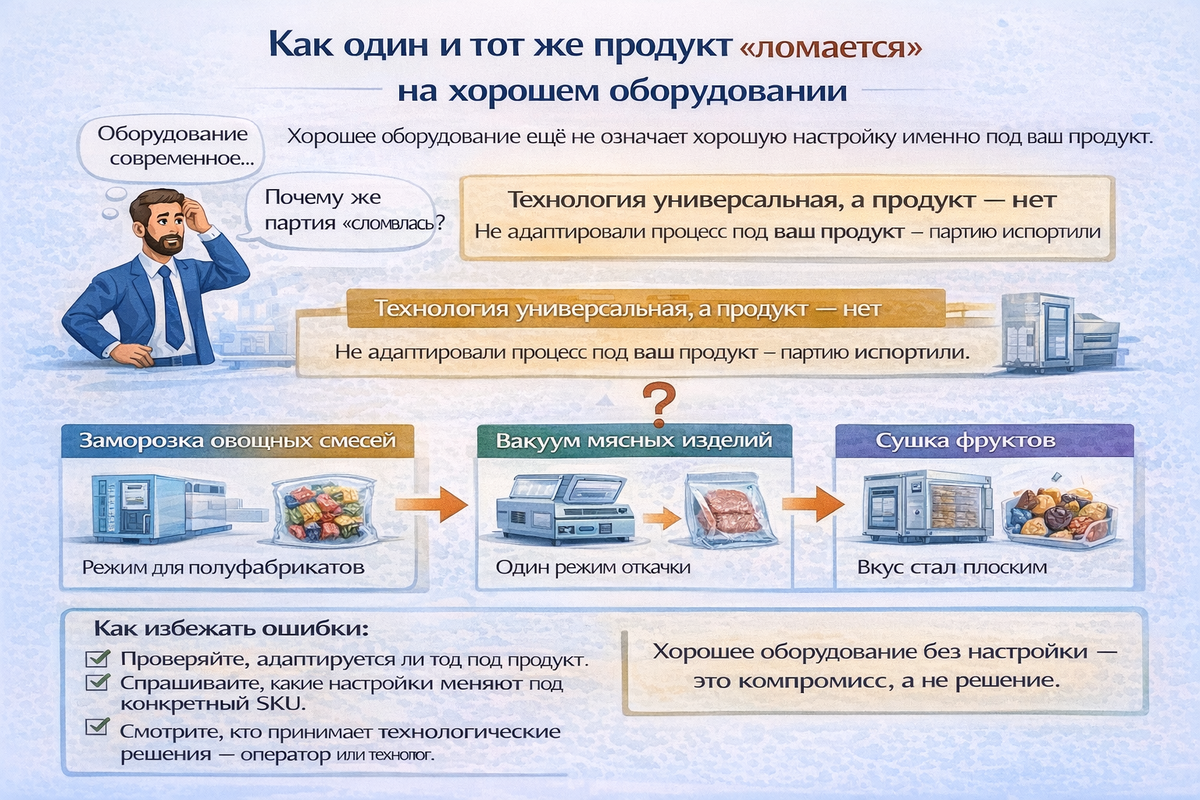 Температура стандартная, но продукт требует ступенчатого режима — вкус становится плоским. Вывод: