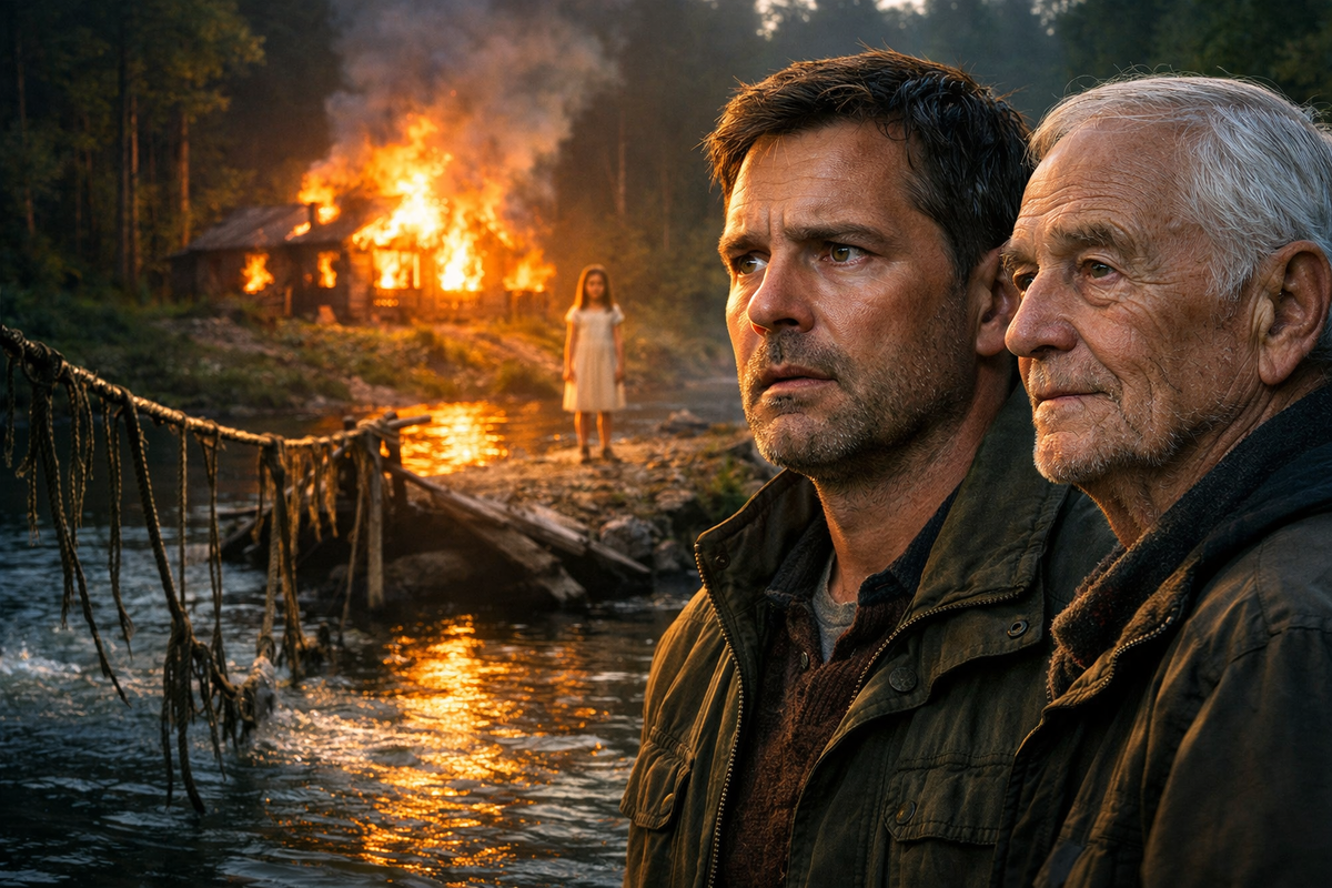 Через некоторое время Евгений снова пошёл туда — и ещё издали почувствовал запах гари. Изба горела. Мост был разрушен. На одном берегу стоял дед Матвей, на другом — Алёнка, освещённая пламенем.