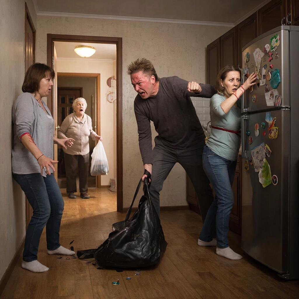 Дмитрий рванул к жене и выхватил у неё сумку так резко, что ремешок оставил красную полосу на запястье. Алина отшатнулась к стене, инстинктивно прижав руку к груди.