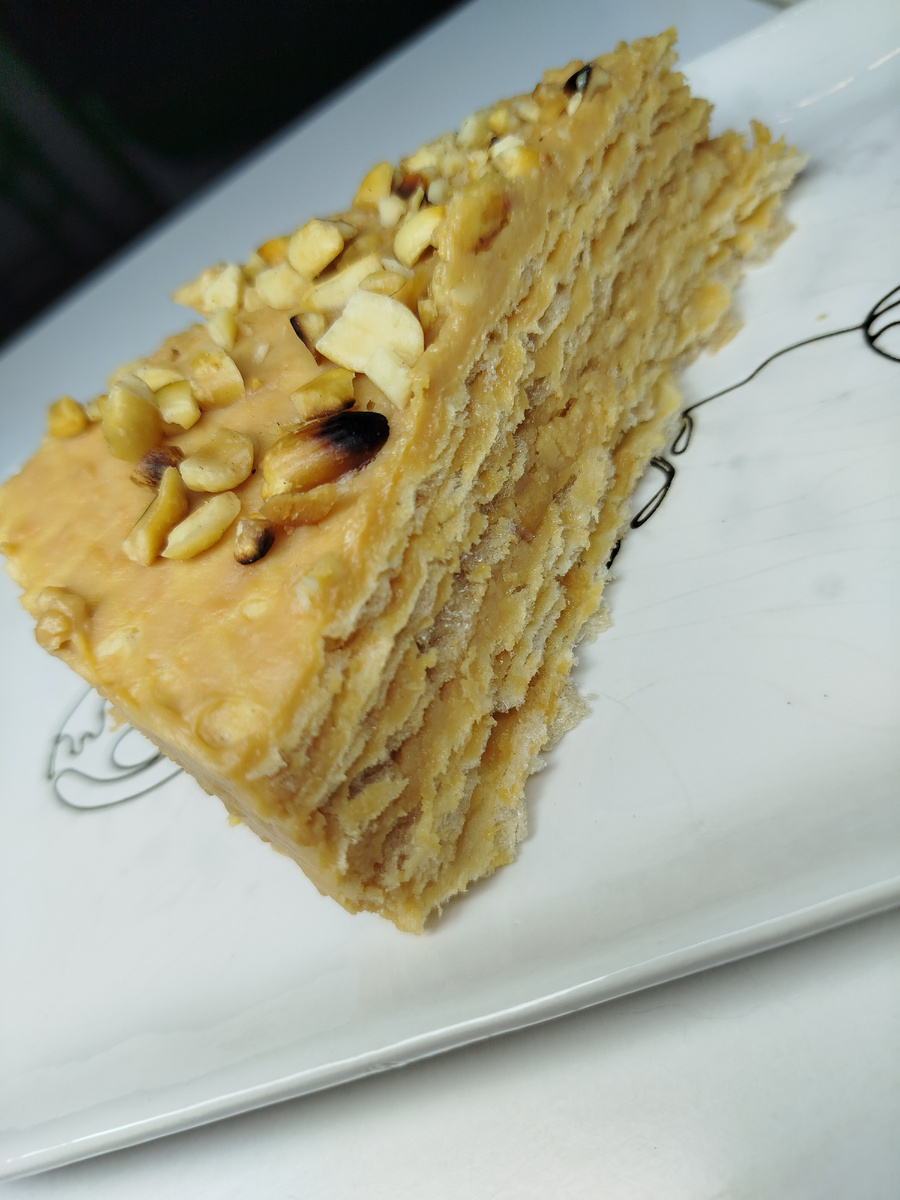 Намазать посередине тарелки этот крем, положить первый корж. Намазать кремом корж и посыпать немного солёным арахисом. Затем все коржи так смазать и наверху тоже посыпать арахисом. Все смазываем и убираем торт в холодильник на несколько часов .
