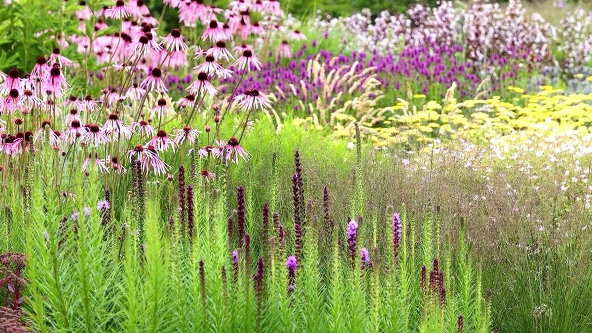 А самые высокие растения, выше 1 метра станут возвышаться в разных частях цветника. Таким образом появится возможность сделать луг более рельефным и живописным.
