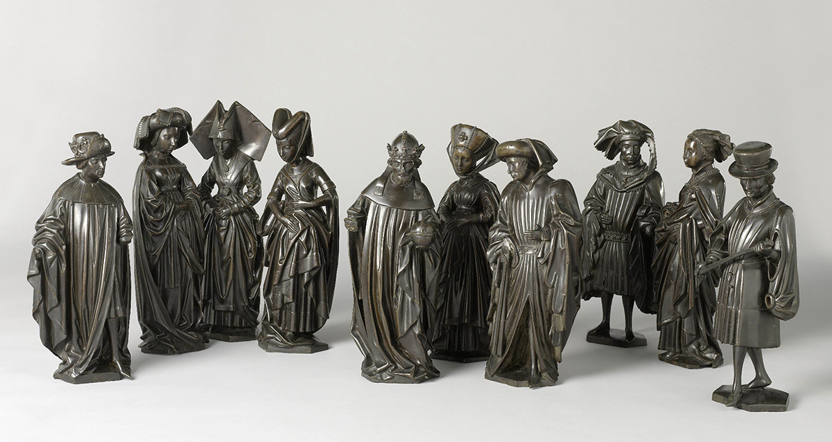 Перед нами набор из десяти статуй, приписываемых фламандским художникам Яну Борману (II) (активен в 1479–1520 годах) и Ренье ван Тиенену (1430–1498). Эти статуи называются "плачущими" или "плакальщицами" и размещались вокруг гробницы, изображая скорбящих. Эти плачущие происходят из гробницы Изабеллы Бурбонской, графини Шароле (1434–1465), второй жены (и племянницы!) герцога Карла Смелого Бургундского. Карл Смелой и Изабелла Бурбонская поженились в 1454 году и имели одного ребенка: Марию Бургундскую. Изабелла умерла в 1465 году от туберкулеза в Антверпене в возрасте всего 31 год. Вокруг её гробницы было размещено 24 плачущих, но сохранились только эти 10 (гробница была разрушена во время иконоборческой ярости 1566 года). Сами статуи дают хорошее представление о моде бургундского двора, хотя они одеты в более ранние наряды, чем у Изабеллы, и, вероятно, являются копиями из более древних гробниц. Статуи изображают не ближайших родственников Изабеллы, а её предков: мужчина в короне и