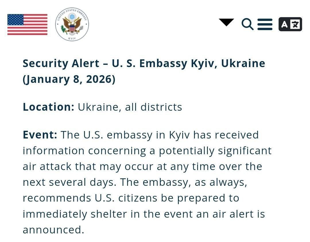 ❗️⚡️Американское посольство в Киеве предупредило о скорой "значительной воздушной/ракетной атаке" со стороны ВКС и РВиА России