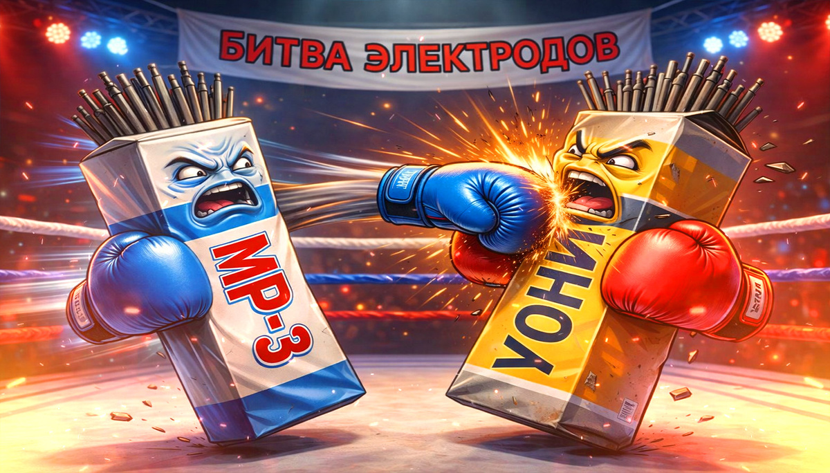 Здорово, мужики! 👋 На связи ваш бессменный рефери в мире раскаленного металла. Сегодня на ринге сошлись два тяжеловеса, два полюса сварочного мира. В левом углу — народный любимец, «синий» боец МР-3. В правом — суровый профи, аристократ с характером УОНИ 13/55. Ставки высоки: кто из них достоин занять место в твоем гараже, а кто отправится в мусорку? Погнали! Удар! Еще удар! Начинаем бой. Берем МР-3, чиркаем... и искра пошла! Этот парень зажигается даже от старого «гудящего» трансформатора или дешевого инвертора. Новичок в восторге, дуга горит, душа поет.