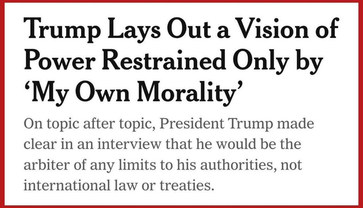 право. Об этом он сказал в интервью The New York Times. «Да, есть одно ограничение (власти). Моя собственная мораль. Мой собственный разум. Это единственное, что может меня остановить. Мне не нужно международное право. Я не стремлюсь причинить людям вред», – заявил президент США. Морали у него я не заметил. А вы? Подпишись на Телеграм Александр Семченко