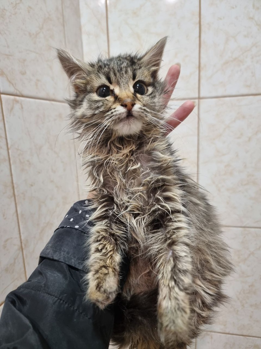 Я даже не знаю, кто это, ну в смысле кот или кошка. "Там" всё заляпано, попробуем отмыть или выстричь. Кости и шерсть, нарушена координация. Поселили пока в туалет, будем разбираться.