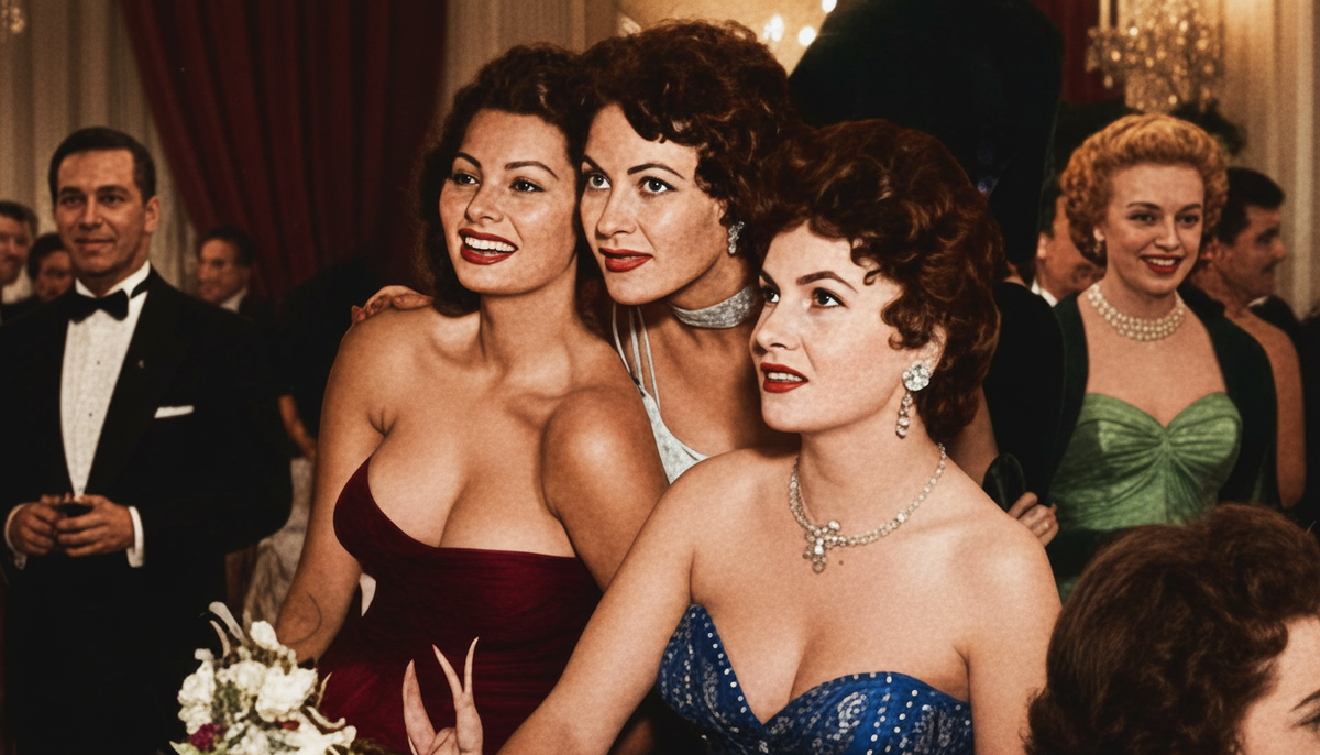 На фотографии запечатлена 18-летняя Элизабет Тейлор в день своей свадьбы с Конрадом «Никки» Хилтоном-младшим, наследником империи отелей Hilton, 6 мая 1950 года в церкви Доброго Пастыря в Беверли-Хиллз. Свадебное платье было создано MGM Хелен Роуз и состояло из 20 ярдов кремово-белого атласа с кружевом и деталями из жемчуга и бисера, вуаль была украшена жемчужным венцом — этот образ позже стал одним из самых легендарных свадебных платьев в истории кино. Церемонию посетили более 700 гостей, а тысячи фанатов Тейлор собрались снаружи церкви, чтобы увидеть молодую звезду. Однако эта сказочная свадьба быстро превратилась в кошмар: Хилтон был алкоголиком и наркоманом, избивавшим Тейлор, включая один инцидент, когда он ударил её по животу, вызвав выкидыш; брак длился всего восемь месяцев, и Тейлор подала на развод 29 января 1951 года по основанию жестокого обращения.