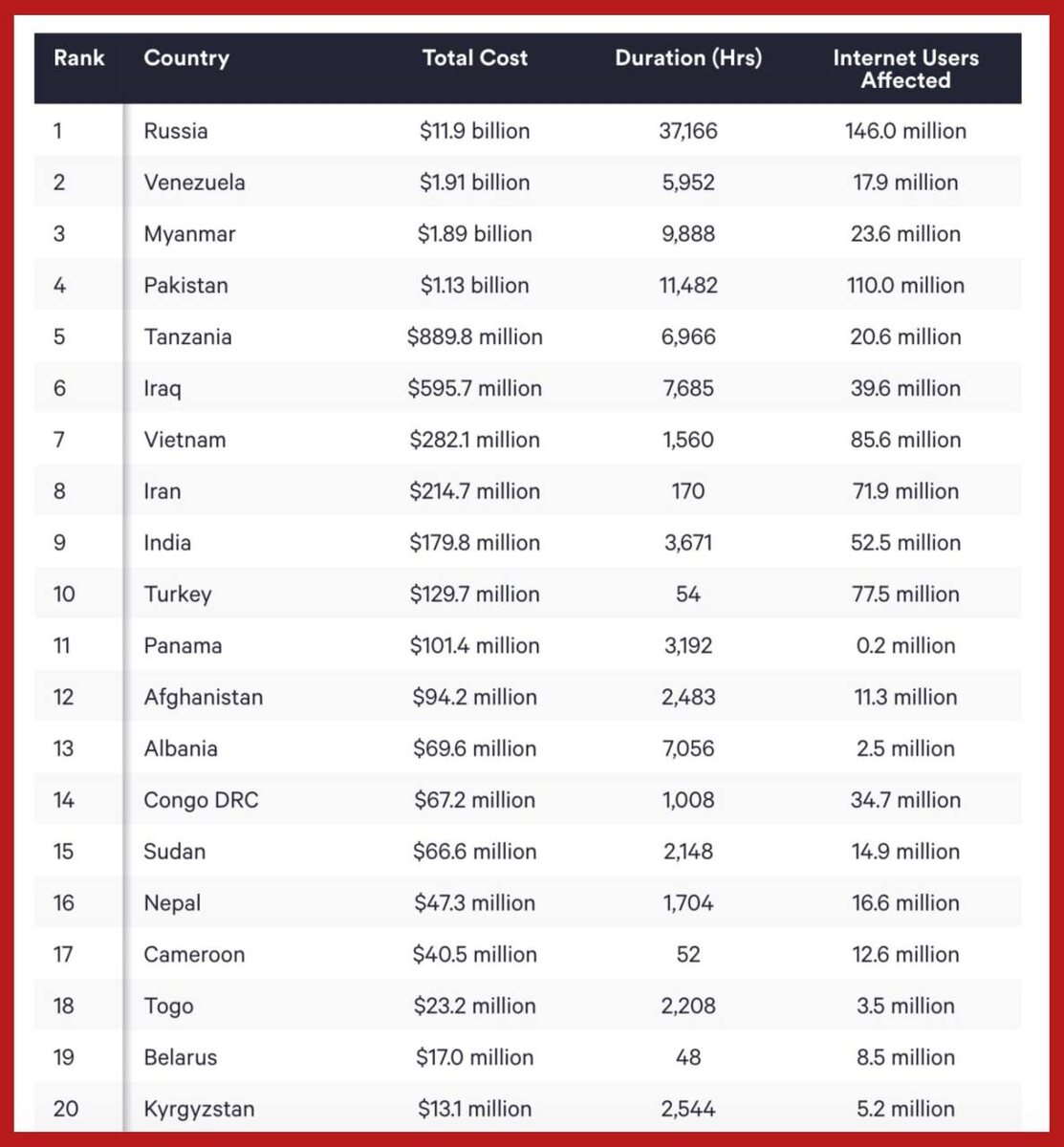 отключениям интернета — за весь 2025 год совокупно все шатдауны длились 37 166 часов. Экономике это обошлось в $11,9 млрд убытками и недополученной прибылью. На втором месте Венесуэлла — там местные просидели в шатдаунах всего 5 952 часа. Кстати, Украина, по территории которой за год было запущено за год около 100 тыс БПЛА, не вошла даже в ТОП-20. Подпишись на Телеграм Александр Семченко