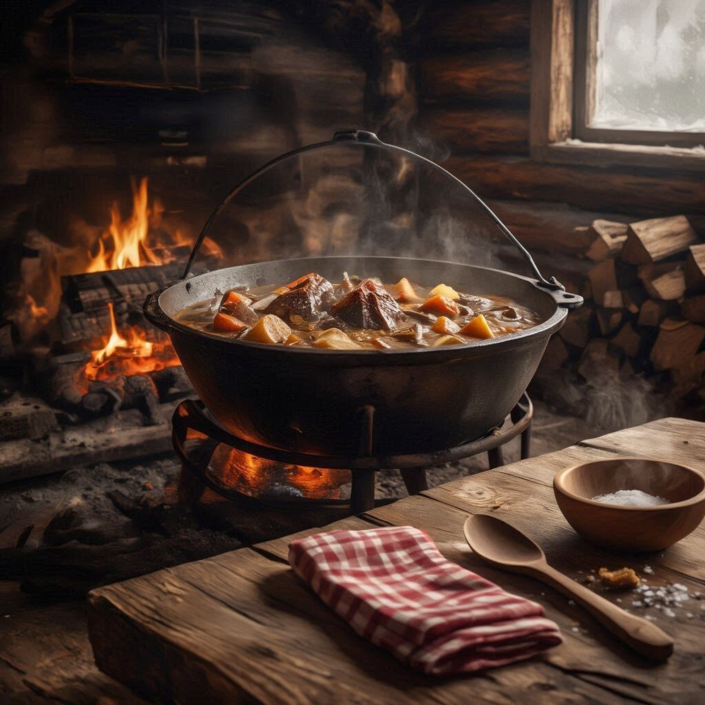 1. 🍲 Большой чугунный горшок охотничьей похлёбки с дичью