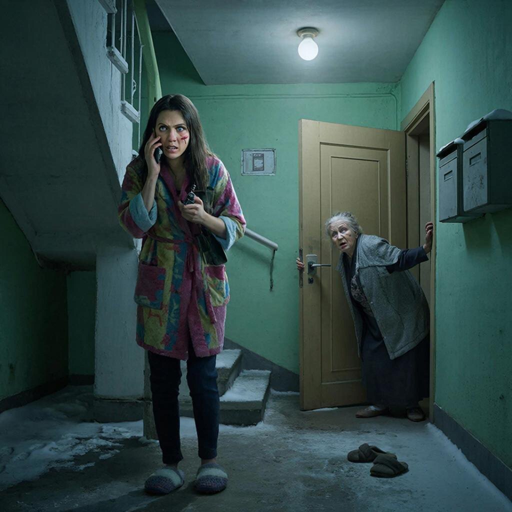 Я стою на лестничной площадке в домашних тапочках и халате. Соседка тётя Клара выглядывает в глазок — слышит же, как орут.