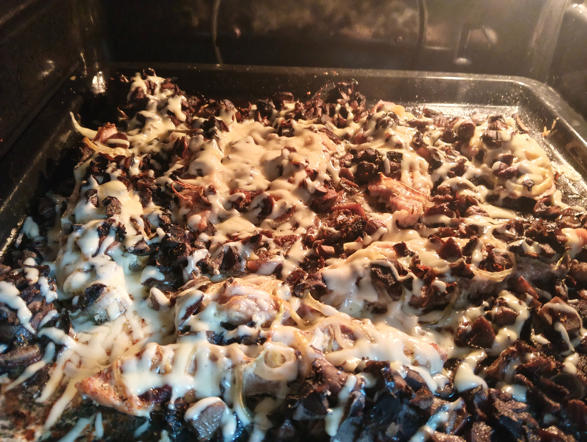 Утром встала, закинула стирку. Сходила в душ. Запекла мясо с грибами и сыром.