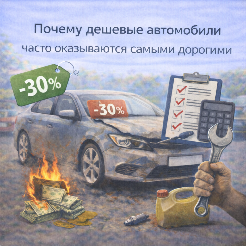 Почти каждый покупатель хотя бы раз ловил себя на мысли: «Вот хороший вариант – и значительно дешевле остальных». Низкая цена создаёт ощущение выгоды, контроля и умного решения. Но именно такие автомобили чаще всего превращаются в самые дорогие – не на этапе покупки, а в процессе владения. Разберёмся, почему дешёвые автомобили почти никогда не бывают выгодными, и где именно покупатель теряет деньги. Причины понятны и человеческие: Низкая цена воспринимается как: Проблема в том, что рынок редко ошибается системно. Автомобиль дешевле рынка почти всегда потому, что: Иногда – сразу всё. Цена – это не подарок, а компромисс, который вы принимаете вместо продавца. Дешёвые автомобили часто: После покупки: В итоге: дешёвый автомобиль догоняет рынок по затратам – а иногда и перегоняет его. На этапе осмотра видно не всё. В дешёвых автомобилях часто: Первые месяцы владения становятся: Экономия исчезает очень быстро. Самая болезненная часть. Когда приходит время продавать, выясняется: Причина та ж