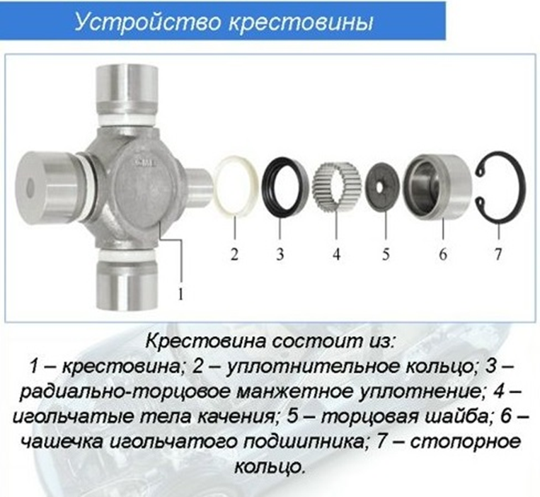 Карданный вал — важная часть трансмиссии внедорожника, которая передаёт крутящий момент от двигателя к ведущим мостам. На нём есть крестовина (обычно их несколько штук) — маленький механизм, который обеспечивает шарнирное положение фланцев при вращении карданного вала и различных углах работы. Если крестовина износилась, это скажется на работе машины и может привести к серьёзным поломкам. Стуки при начале движения. Когда крестовина изношена, при начале движения или переключении передач появляется громкое цоканье или удары.