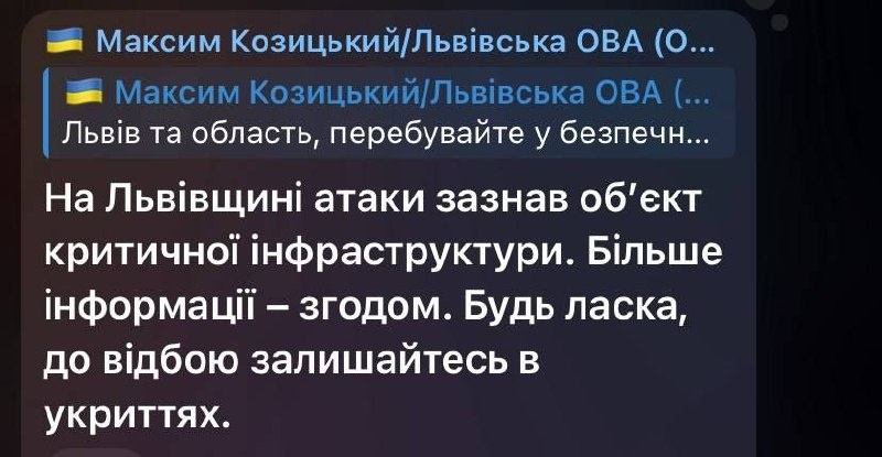 Глава Львовской ОВА сообщает о повреждении объекта критической инфраструктуры в результате удара во Львовской области. Предположительно, под удар попал объект в городе Стрый. Военный Осведомитель