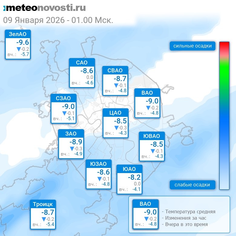 В 1:00 в Москве было от -10°C до -7.7°C, средняя температура -8.7°C #погода #Москва #зима #температура #9января #пятница