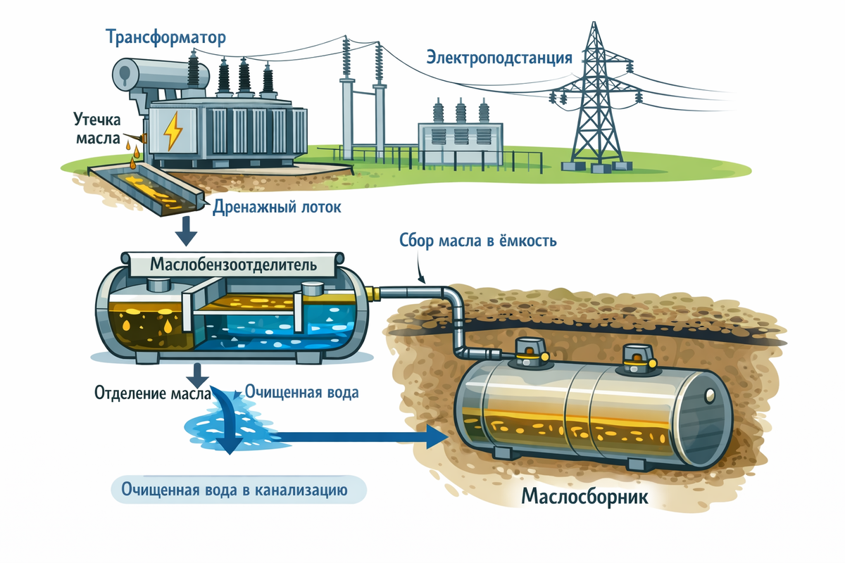 На подстанции всё строго по инженерной логике: если есть риск пролива трансформаторного масла — значит, должна быть система, которая перехватит, удержит и даст возможность безопасно откачать. Потому что масло в грунте и ливнёвке — это не “неприятность”, а вполне реальные последствия: экологические, пожарные, организационные и финансовые.