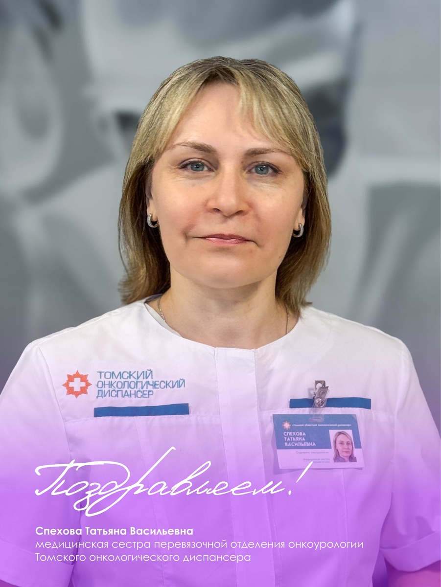 онкологического диспансера. Татьяна Васильевна успешно трудится в коллективе Томского онкологического диспансера чуть более года. Её профессионализм, ответственность и внимательное отношение к пациентам являются неотъемлемой частью ежедневной работы отделения. Она уверенно справляется с поставленными задачами, проявляя заботу, тактичность и искреннее участие в судьбе каждого пациента. За добросовестный труд Татьяна Васильевна была отмечена Благодарственным письмом Томского онкологического диспансера. Поздравляем Татьяну Васильевну с Юбилеем! Желаем крепкого сибирского здоровья, счастья и удачи во всех начинаниях!