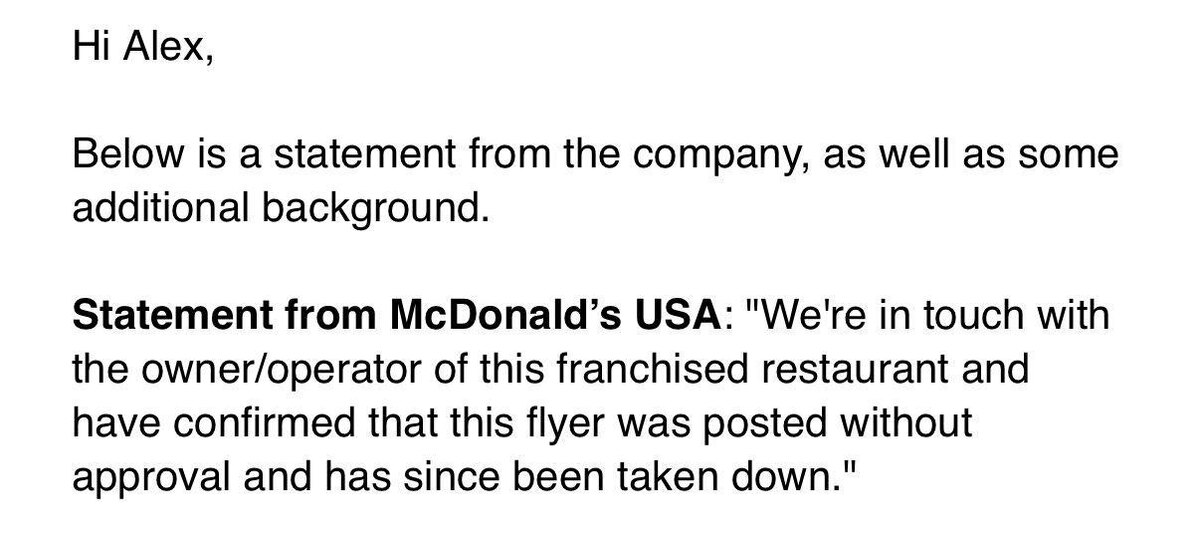 McDonald’s flyer saying NO ICE ALLOWED was posted ‘without approval’ — McDonald’s corporate statement