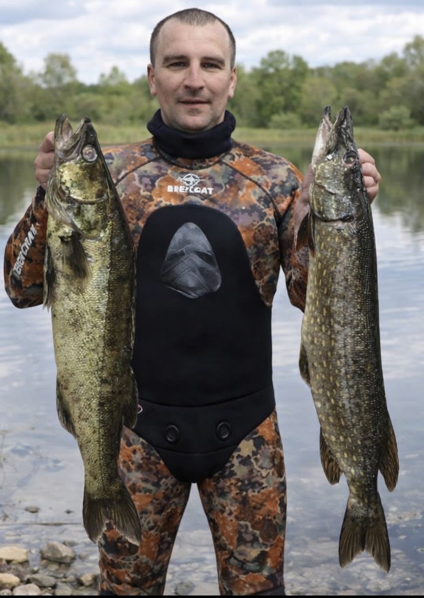 Приехали с напарником на реку.Доехали до места уже под вечер.Еще нерестовый запрет не начинался осталась неделька.Но решили машину все ровно убрать от взгляда.Заехали на верху бугра в лесок и заложили проезд ветками и машину тоже замаскировали.Река в низу излучина.Ланшафт дна большие камни с машину наложены в разброс как скалы размером с машину и с первый этаж дома.Ныряю и на
