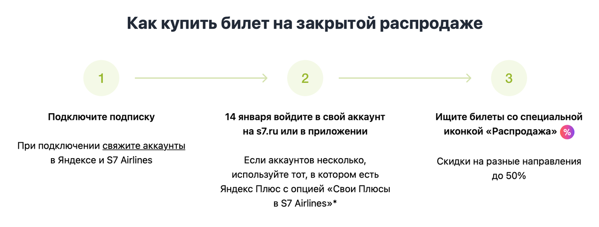 До этого, 14 января 2026 года c 00:00 до 23:59 авиакомпания S7 Airlines проводила закрытую распродажу авиабилетов со скидками до 50% для тех, у кого подключена опция «Свои Плюсы в S7 Airlines».