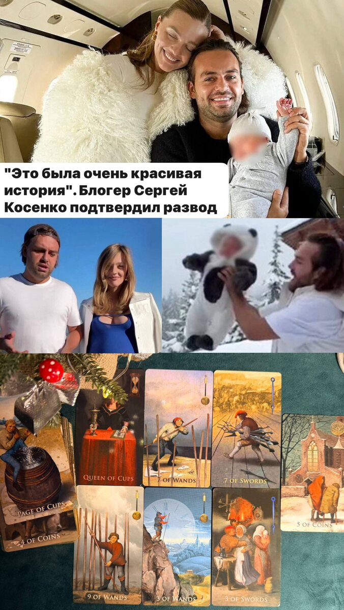 кидали в сугроб, решилась-таки на развод. Честно сказать, после их «красивой истории» не верю не в саму историю, ни в то, что она когда-нибудь закончится. Жульё, что с них взять? В основе расклада—дети пары, которых уже двое. Подозрительно много жезлов в раскладе, а значит разногласия есть, как есть и планы на будущее (3 жезлов). Банальный кризис (5 пентаклей), эмоции зашкаливают, ну и проблемы с деньгами вполне имеют место быть. Тут либо и впрямь, третий ребенок не состоялся, либо обманывает Сережа Сашу с кем-то (3 мечей, 7 мечей) У Саши много претензий к мужу, а муж похоже не напрягается. А собственно, когда эти люди напрягались? Разведутся ради хайпа, сойдутся. Вообще неинтересно.