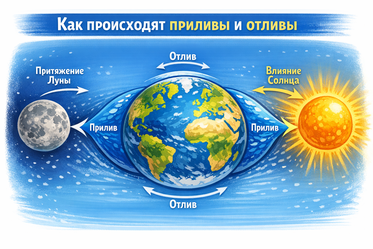 🌙 Луна притягивает воду — возникают приливы
